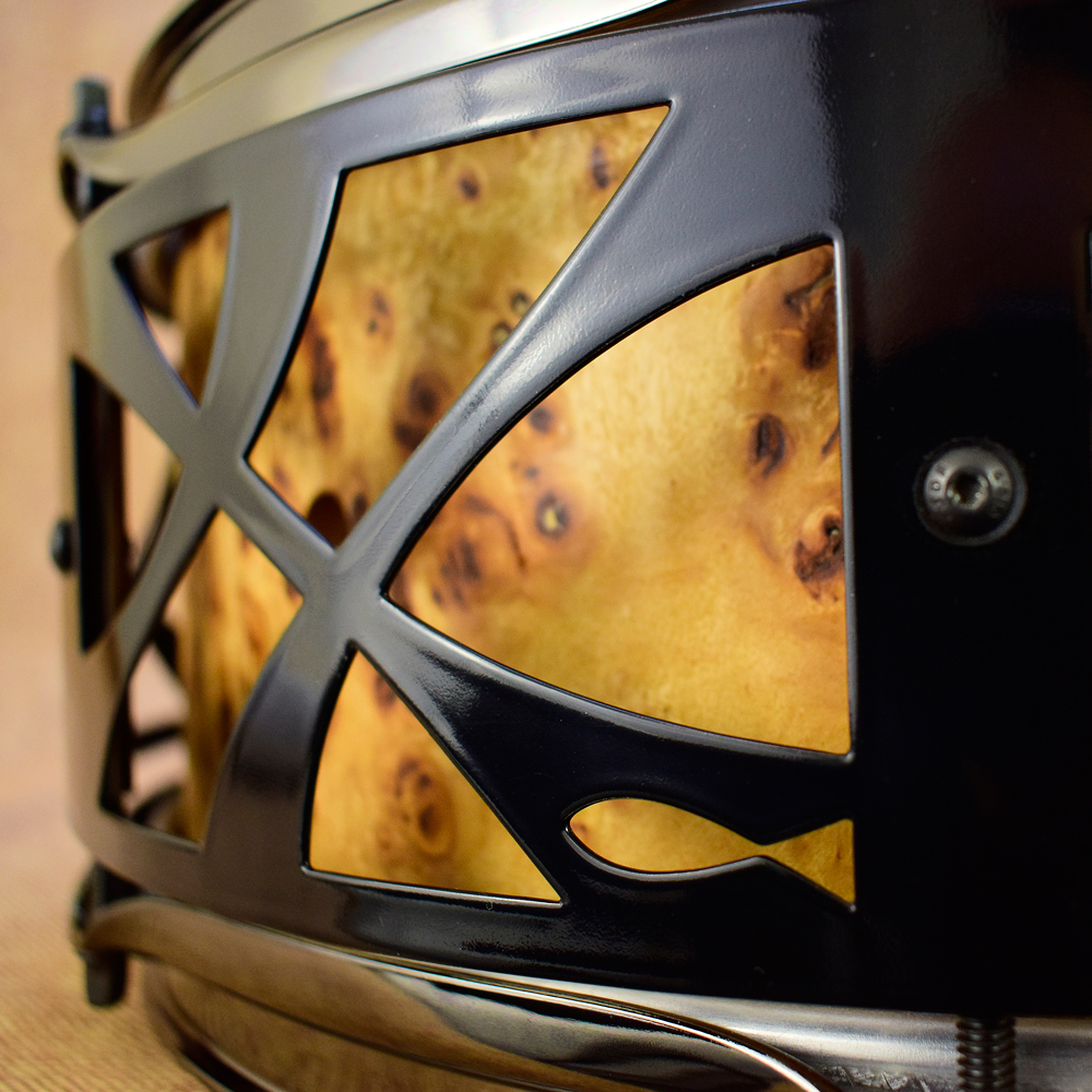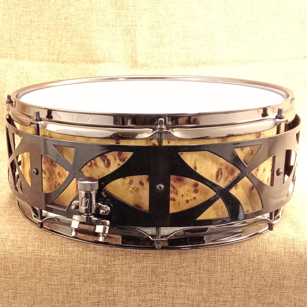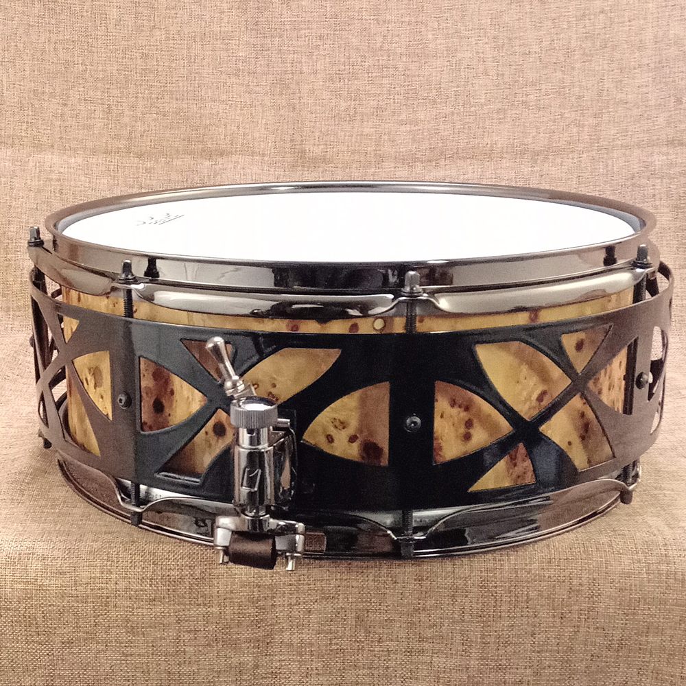 This multi-wood stave snare drum has a burl veneer on the outside and a walnut veneer on the inside. The finish is a non-toxic hard wax.
